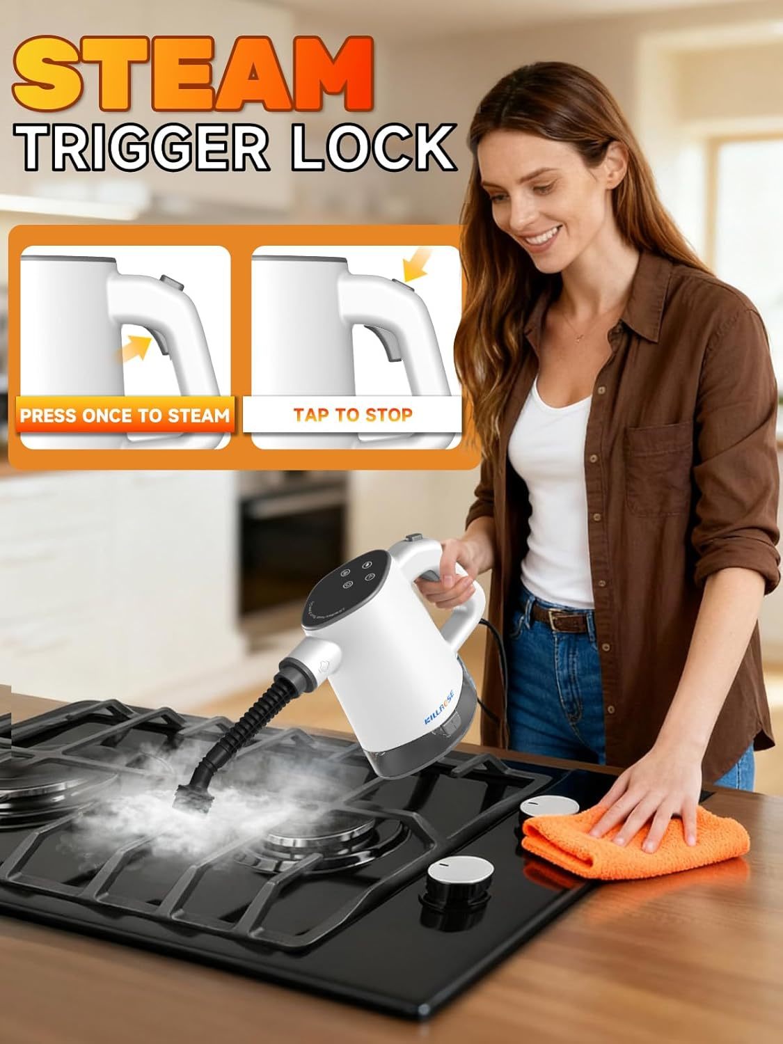 - Ergonomic Design with Steam Lock: Clean in Total Comfort. This handheld steamer for cleaning features an easy-lock function for continuous steam, so you never have to hold down a trigger. Combined with its lightweight build, it’s the ideal hand steamer for cleaning high windows, tight corners, and grout without fatigue