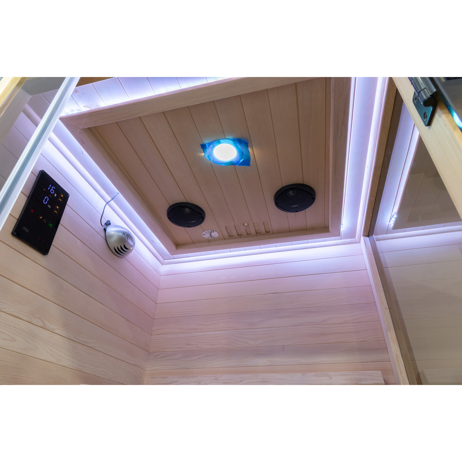Intellective control panel with WiFi, USB and Bluetooth functions, combined with oxygen ionizer, therapy colored star lights, surround light strip and loud speakers, creating a luxurious and personalized sauna experience.