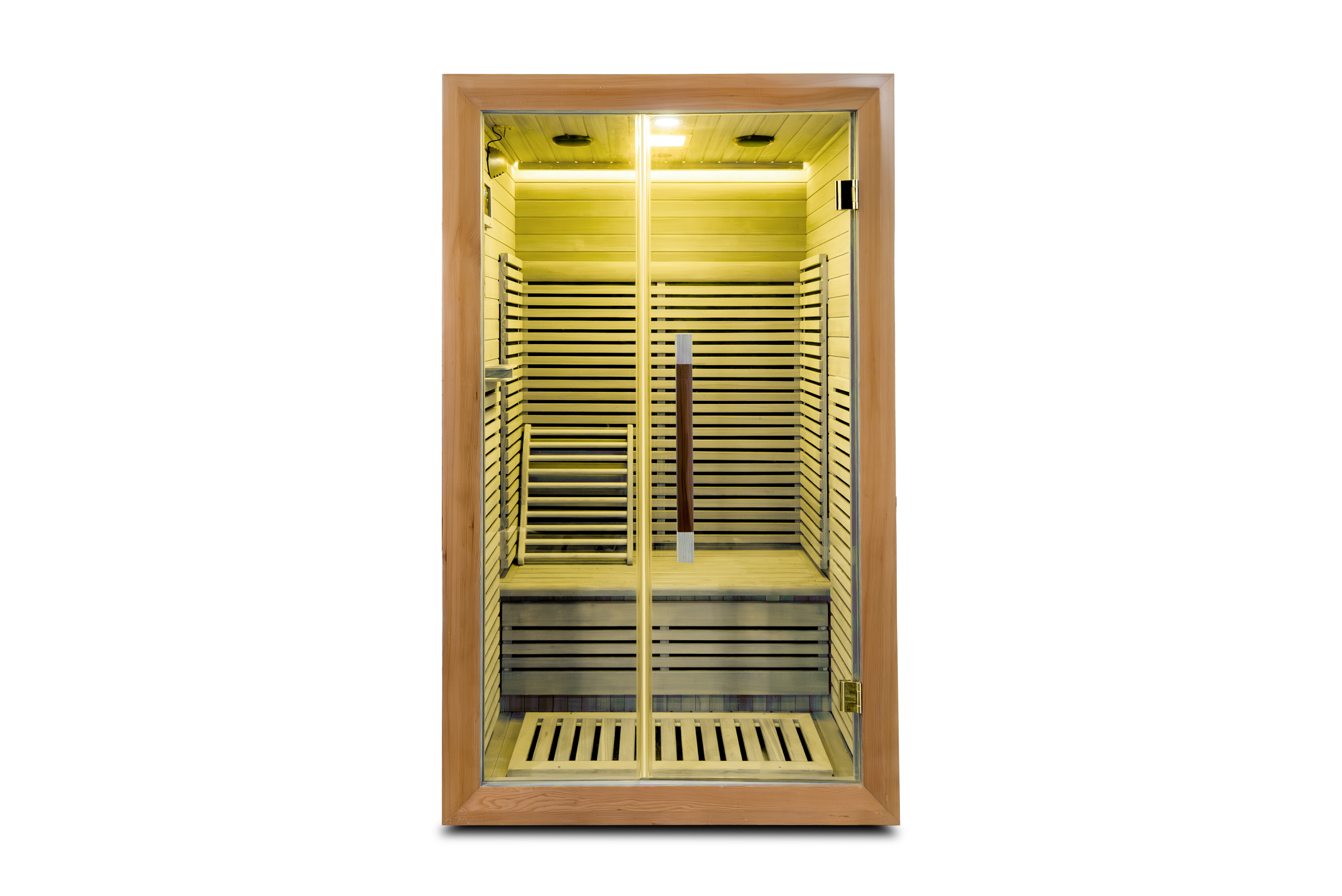 Indulge in spa-grade skin care at home with our dry infrared sauna! Crafted from premium Hemlock solid wood (Model MG-EV004p), this 2-person sauna delivers gentle full-spectrum far-infrared heat (1800W, 110/220/230V) that deeply nourishes skin, boosts collagen production, and improves texture—no harsh steam, just gentle care. Enhanced with WiFi/USB/Bluetooth smart control, brown tempered glass, and wall temperature regulation, it combines skin-nourishing benefits with body detox, and better circulation for a holistic home wellness experience.