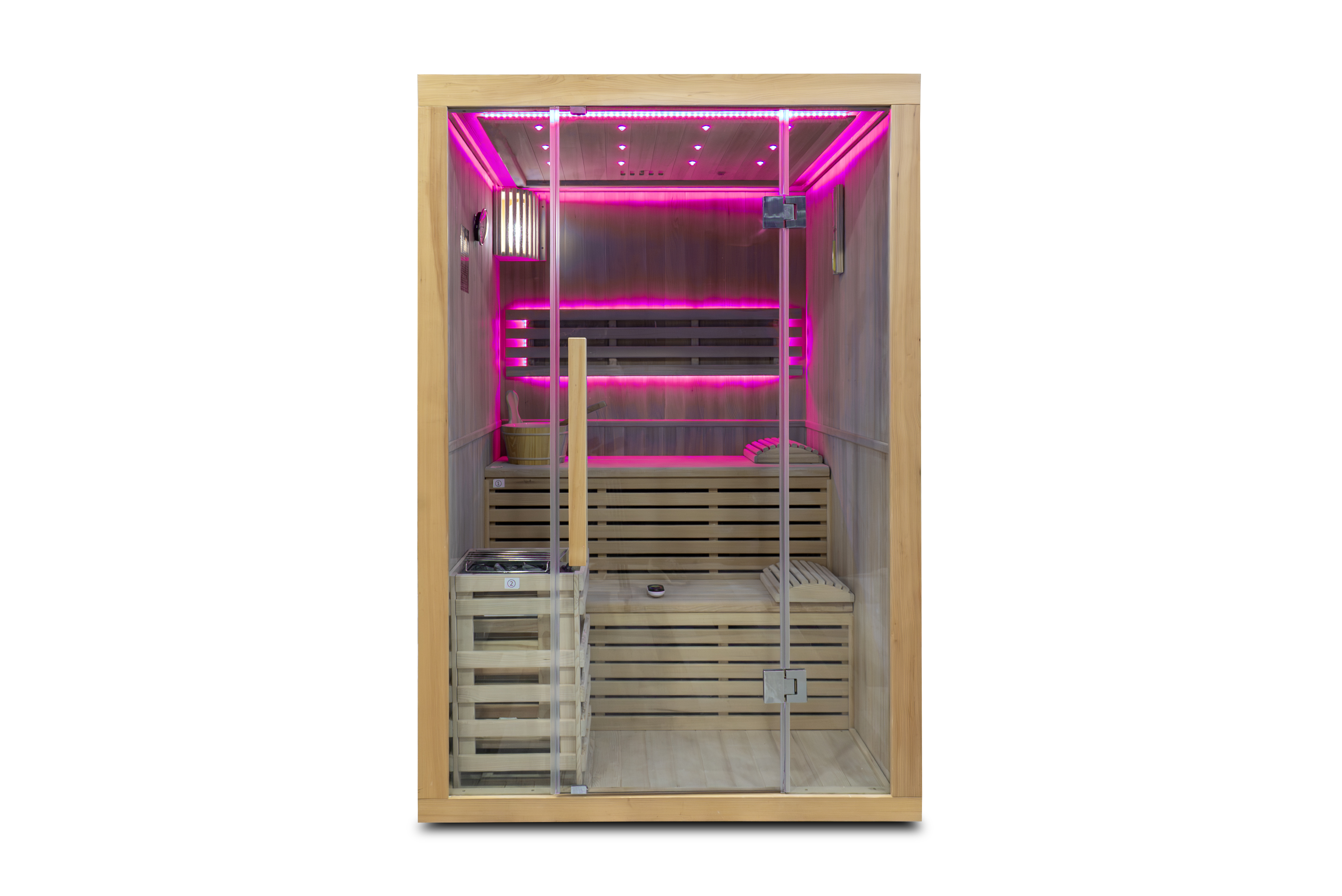 Constructed from durable, natural Hemlock solid wood, this indoor sauna offers a spacious 2-person layout (130*120*200cm) with a timeless, modern design that complements any home interior.